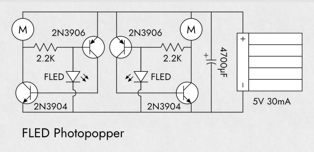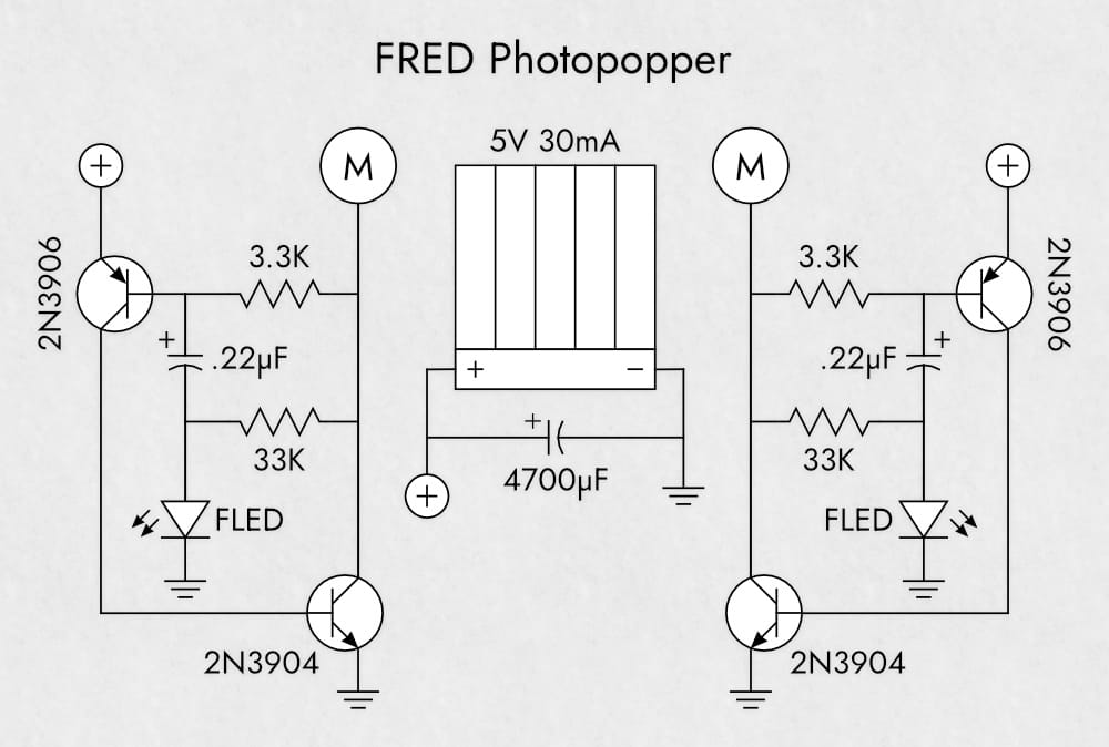 I built another photopopper, this time using the FRED solar engine: an improved, more efficient version of the simpler FLED design. Like my first one, it uses a 4700µF storage capacitor and a 5V solar panel.