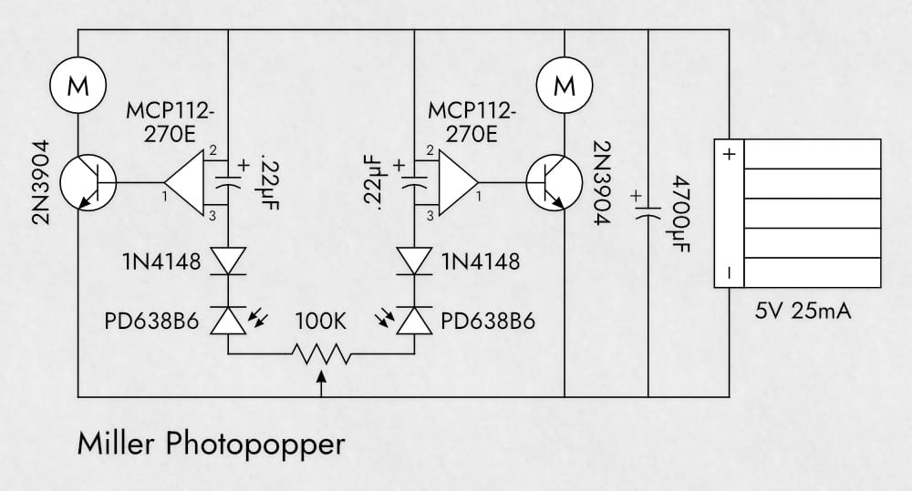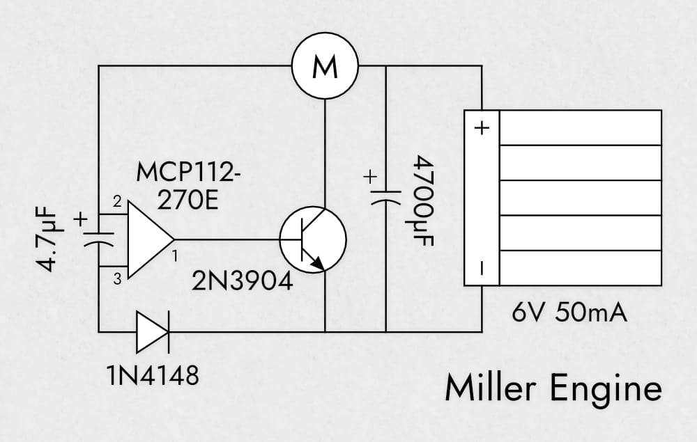 A simple desktop spinner using the Miller engine. It uses a 2.2µF timing capacitor and an MCP112-270E that triggers the circuit at 2.63V, powered by two solar panels in series providing 6V.