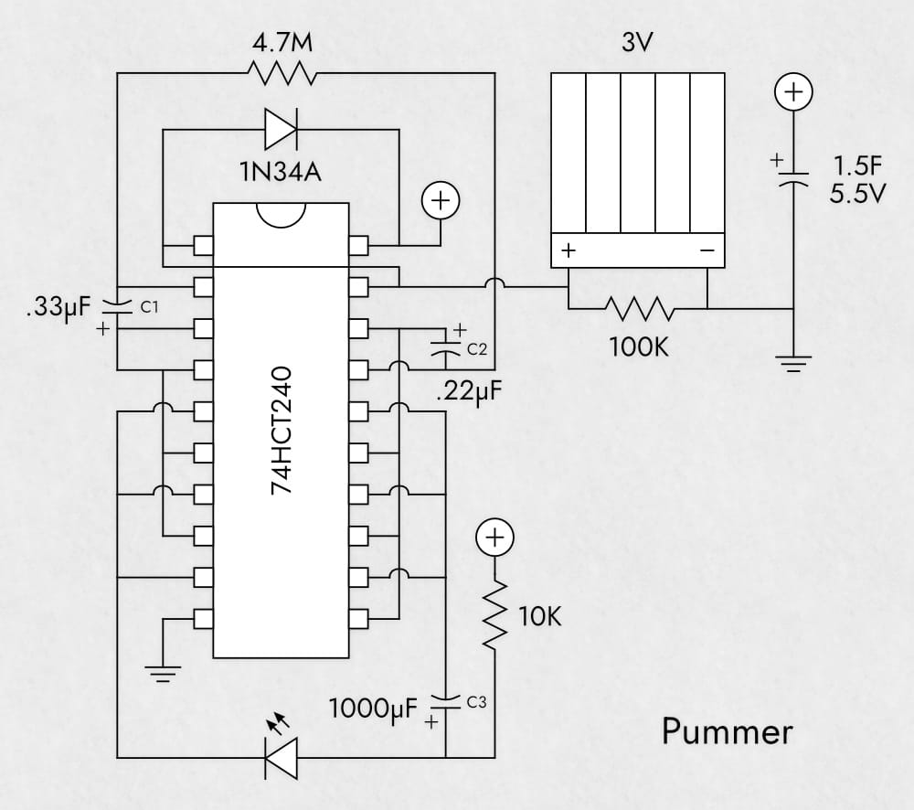 A pummer is nocturnal - it soaks up light during the day and pulses, or "pumms", an LED when it gets dark. I used a 1.5F supercapacitor to store the energy and a 74HCT240 chip to do the thinking. The solar panels are taken from two solar rockers.