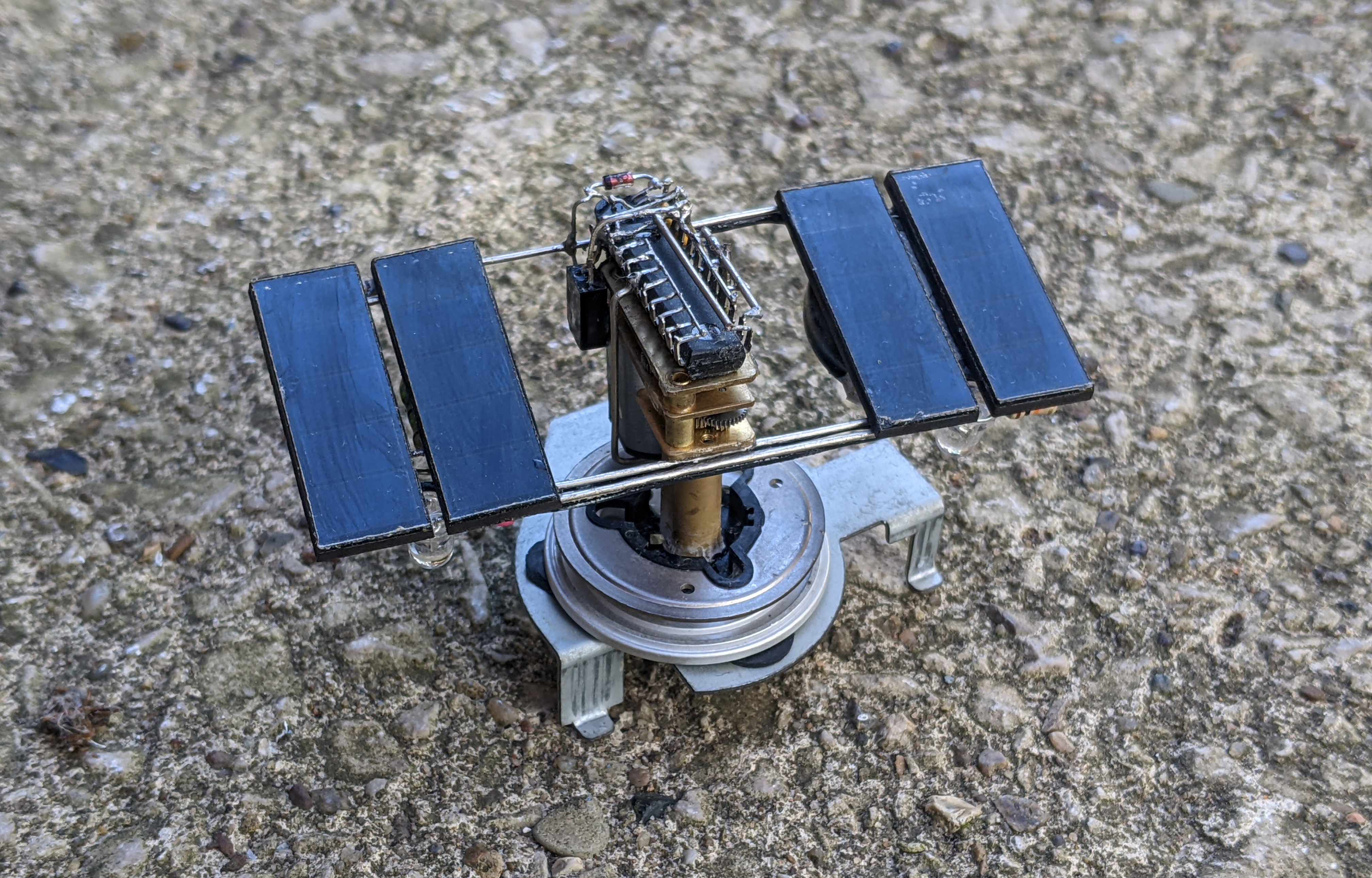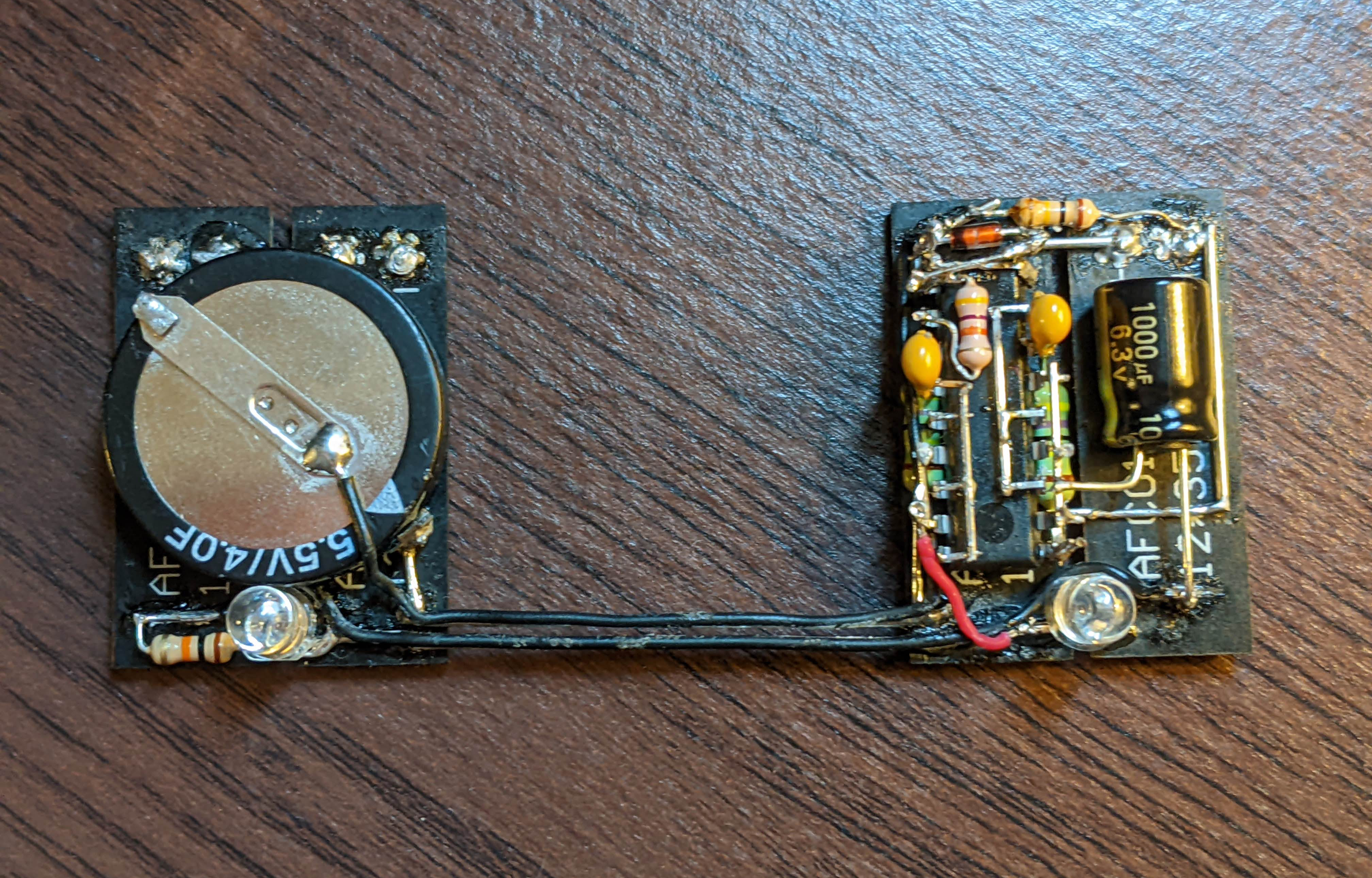 Each pair of solar panels is wired in series, with one pair (the robot's left) dedicated to the head circuit, and the other charging a beefy 4F supercap for the pummer. This is why, 11 seconds into the video, it takes longer for the robot to turn to the right once I've rotated it - the panels powering the head circuit are further away from the light.
