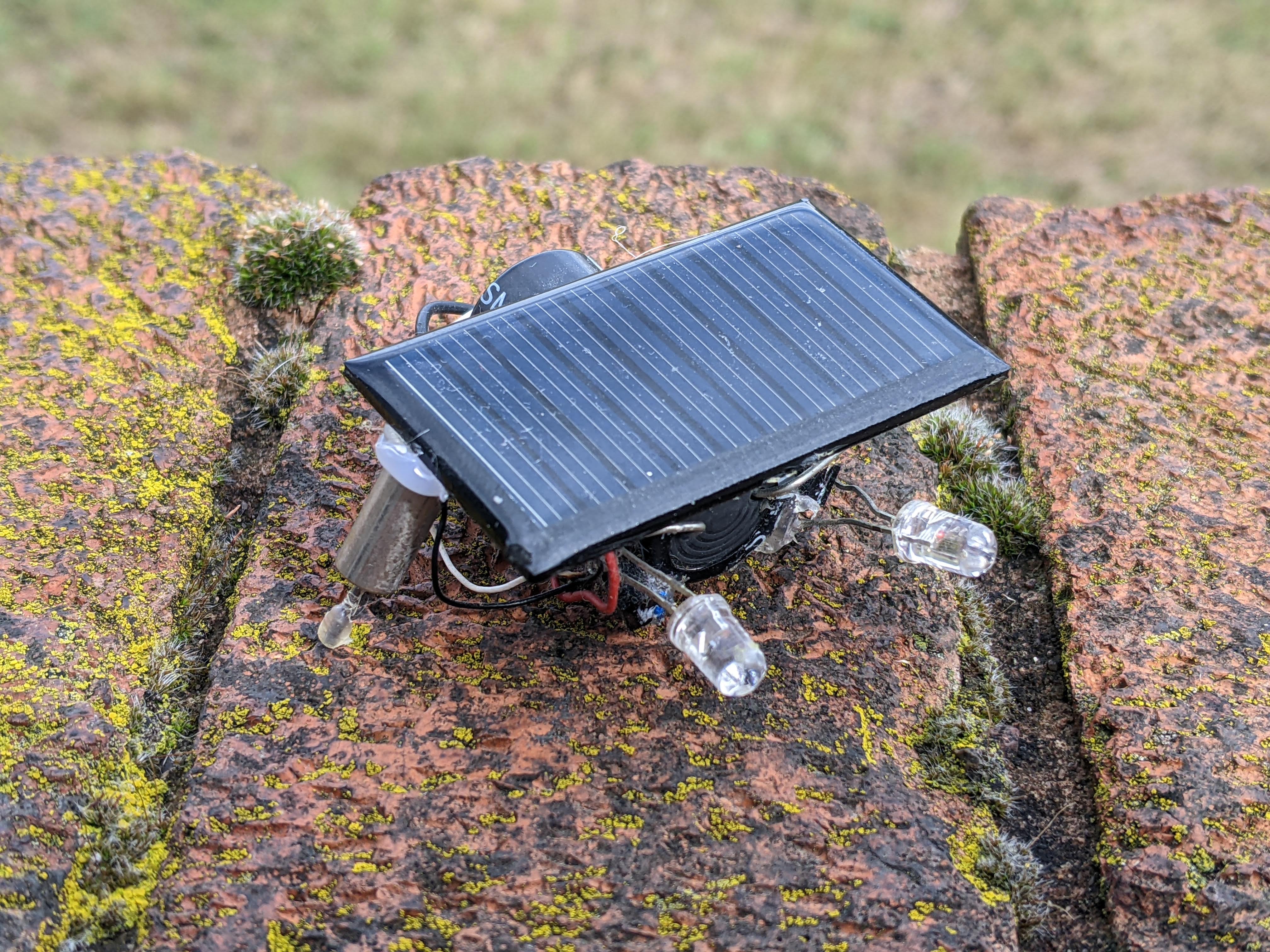 My first foray into the world of BEAM bots (and electronics in general) ended in this little monstrosity. It uses the simplest solar engine there is: the FLED-based solar engine, named such because it exploits the properties of flashing LEDs to do its thing. It has two engines, one for each motor.