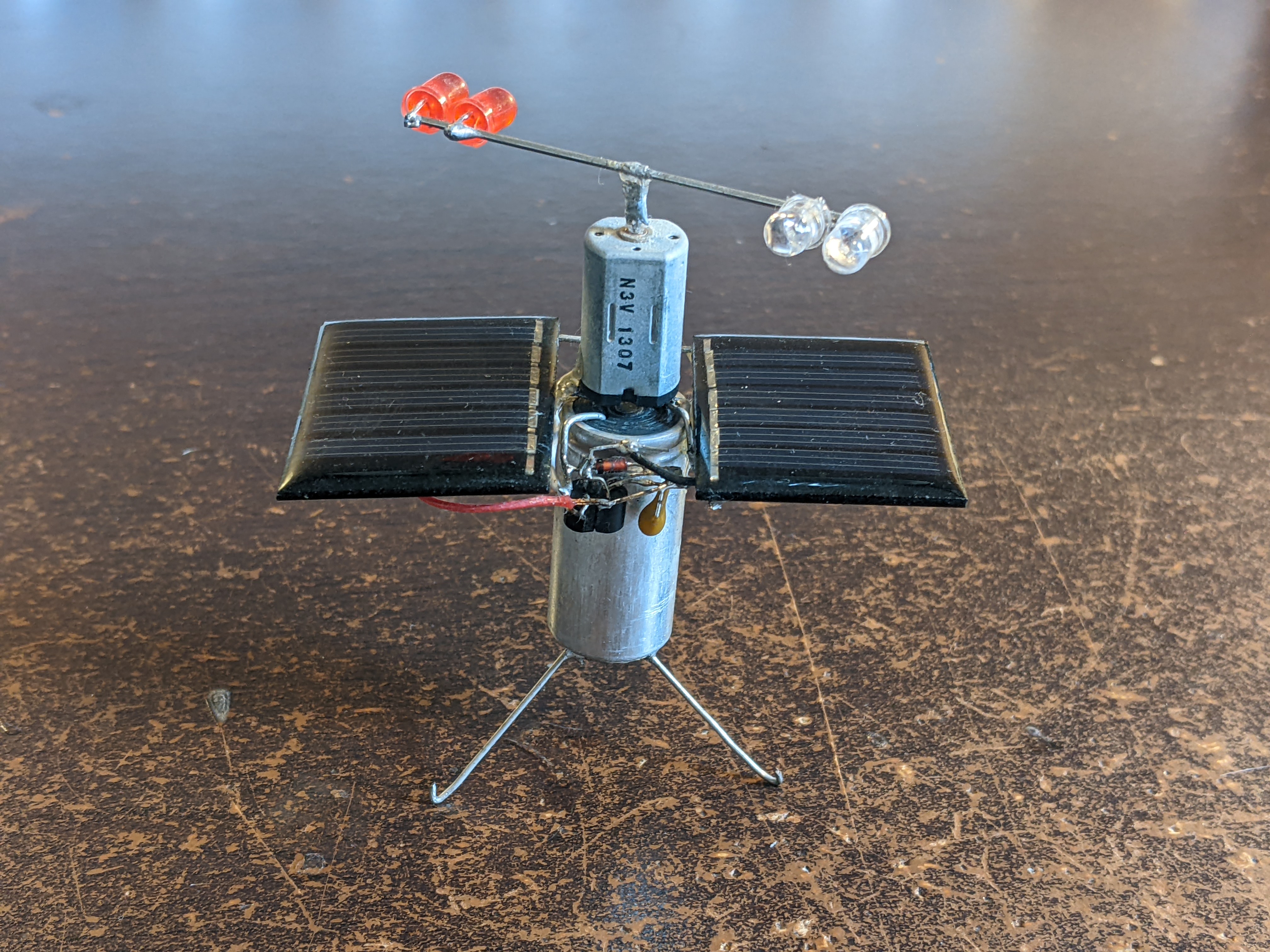 A simple desktop spinner using the Miller engine. It uses a 2.2µF timing capacitor and an MCP112-270E that triggers the circuit at 2.63V, powered by two solar panels in series providing 6V.