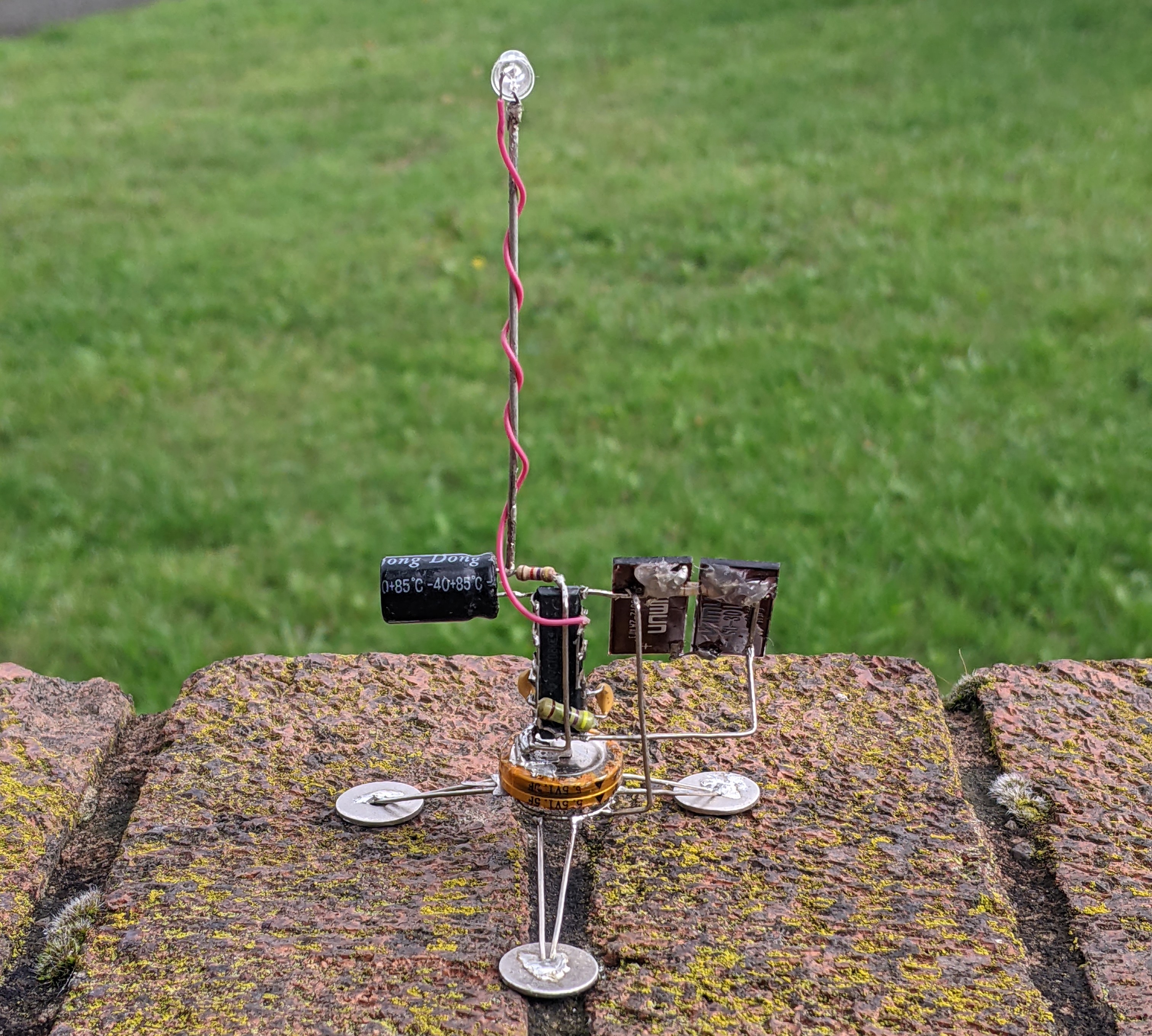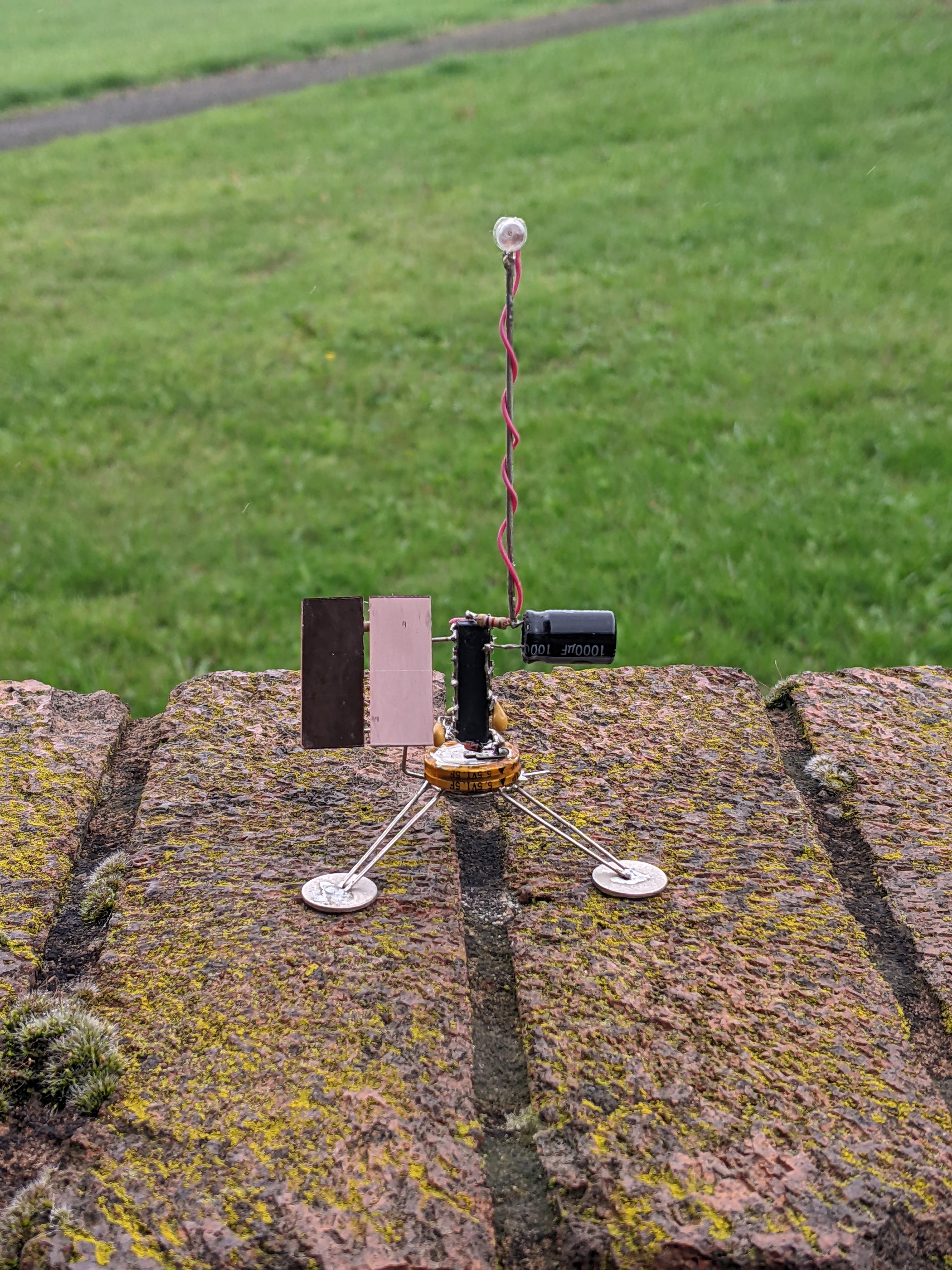 Unfortunately, this bot only blinks away for about an hour and a half before draining its energy, which was a bit disappointing. I was quite pleased with the design, though - I was aiming for something that looks like it belongs on the surface of Mars...only made out of paperclips and held together with hot glue!